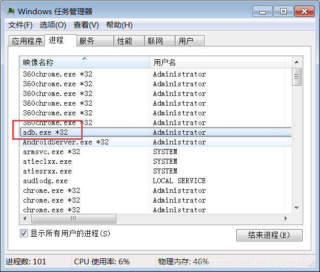 adb有三部分,分别是adbd、adb server、adb client;当手机使用USB或者同网段连接时, adb server会主动去连接Android系统底层运行的服务就是adbd。adb server可以在任务管理器里面找到它的进程,如下图: