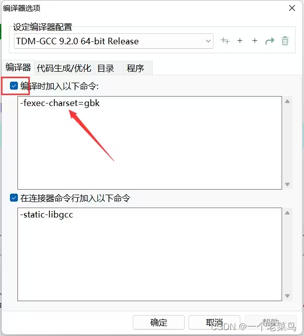 2、在“编译器选项”对话框的标签“编译器”中勾选“编译时加入以下命令”,在下方的输入框中输入以下内容,然后点击“确定”完成设置