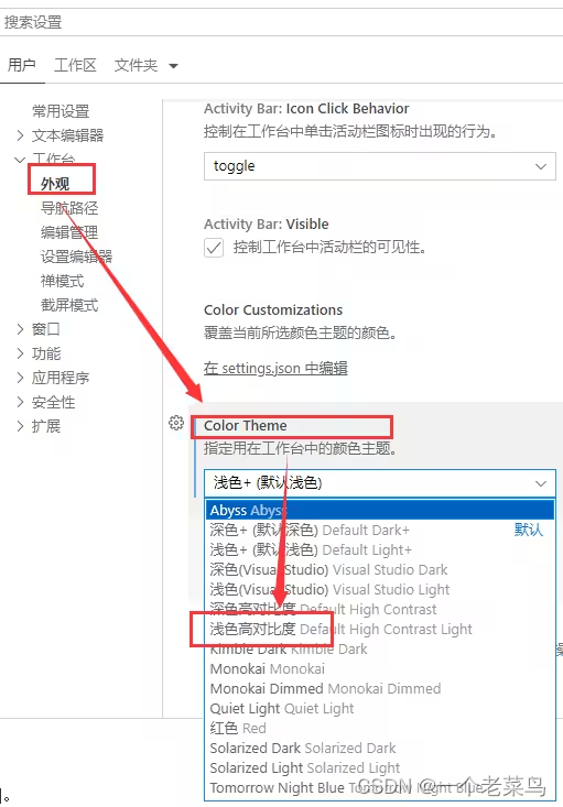 本文介绍了如何在VSCode中通过两种方式更改默认的深色风格为其他颜色主题:一是直接在快捷工具栏中选择,二是进入设置菜单调整工作台外观。