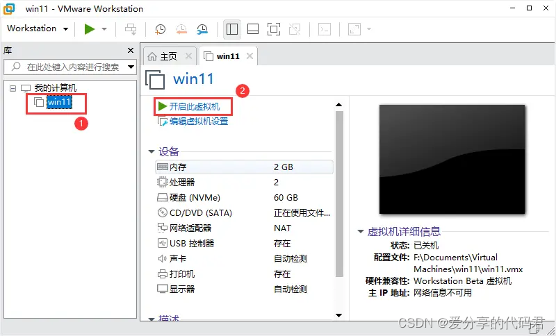 1、在主界面左侧的客户机列表中选择”Win11“,在右侧选项卡中点击“开启此虚拟机”。