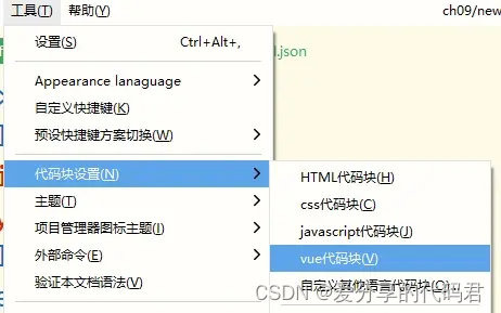 点击菜单”工具“——”代码块设置“——”vue代码块“
