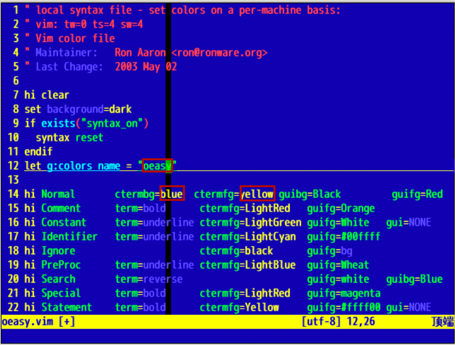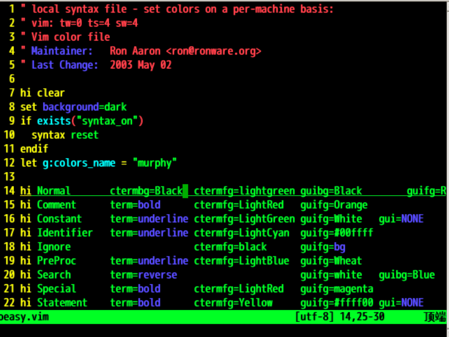 #找到colors的位置 cd usr/share/vim/vim81/colors #列出所有配色方案 ls #复制出自己的配色方案 sudo cp murphy.vim oeasy.vim #查看配色方案信息 sudo vi oeasy.vim