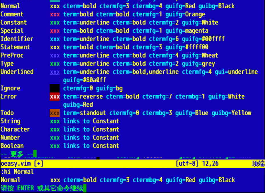:hi Normal可以查看Normal组的配色:hi可以查看当前色彩方案所有的配色xxx就是效果预览