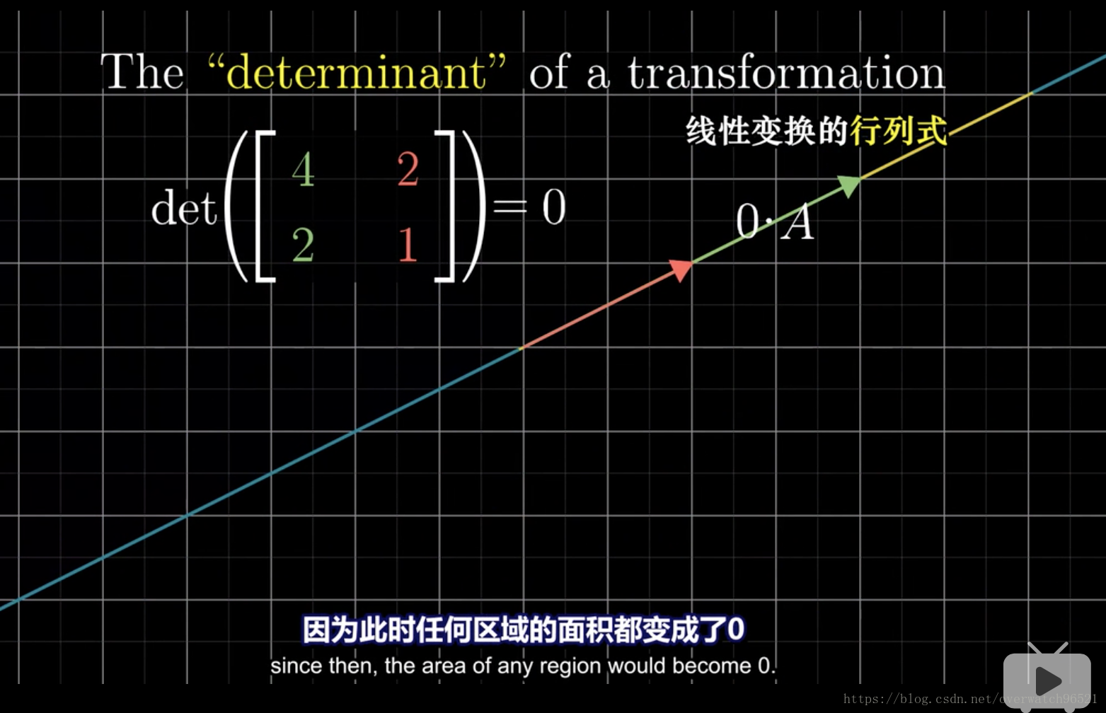 但行列式是可以有负值的,负号的意义是空间定向发生变化(类似将一张白纸反过来),也可以这么理解:变换之前基向量i在j的右侧,变换之后i在j的左侧。此时行列式的绝对值仍然表示区域面积的缩放比例。