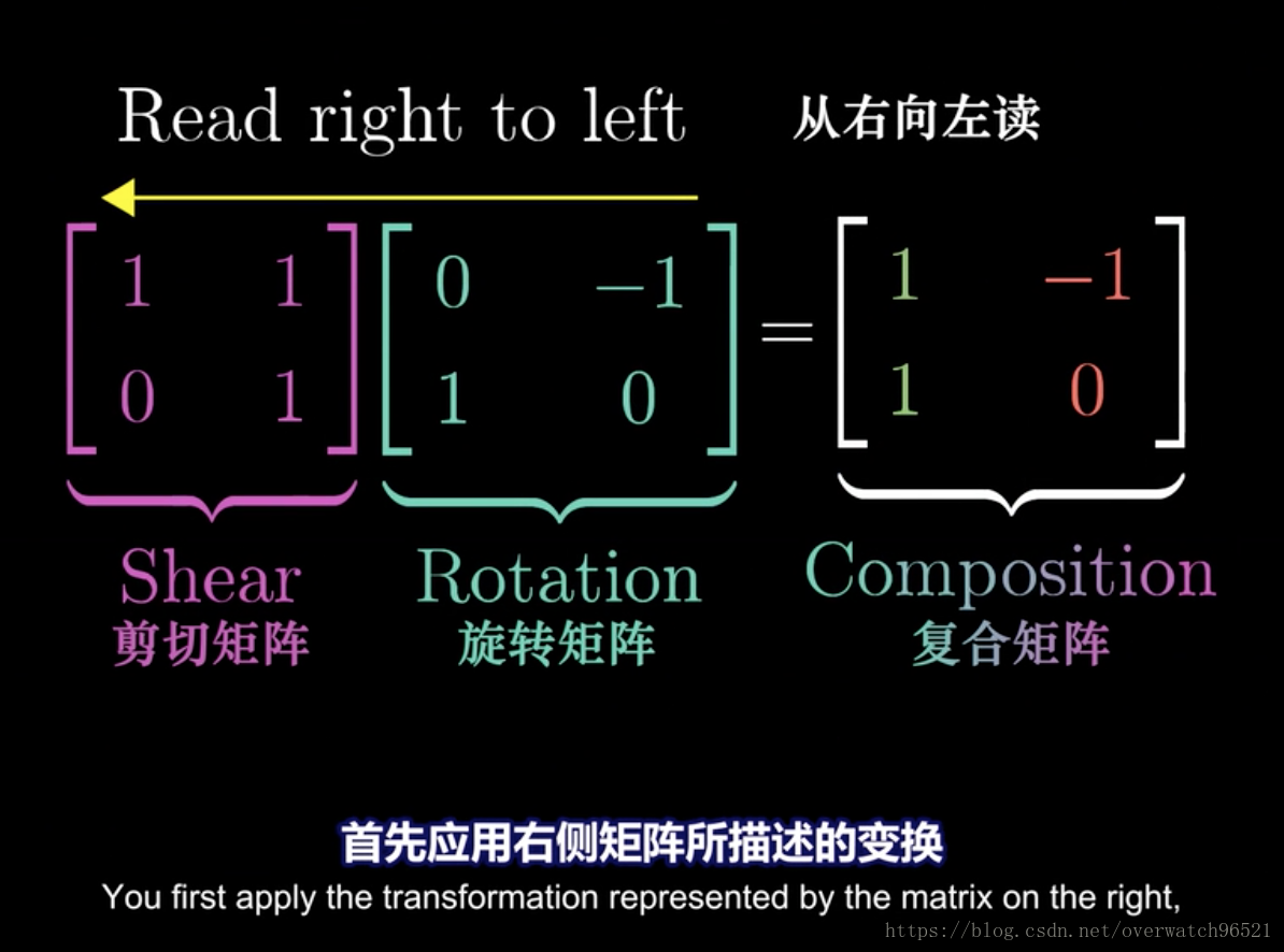 矩阵乘法的结合律也很容易理解了,(AB)C=A(BC),因为都是从右往左相继做线性变换