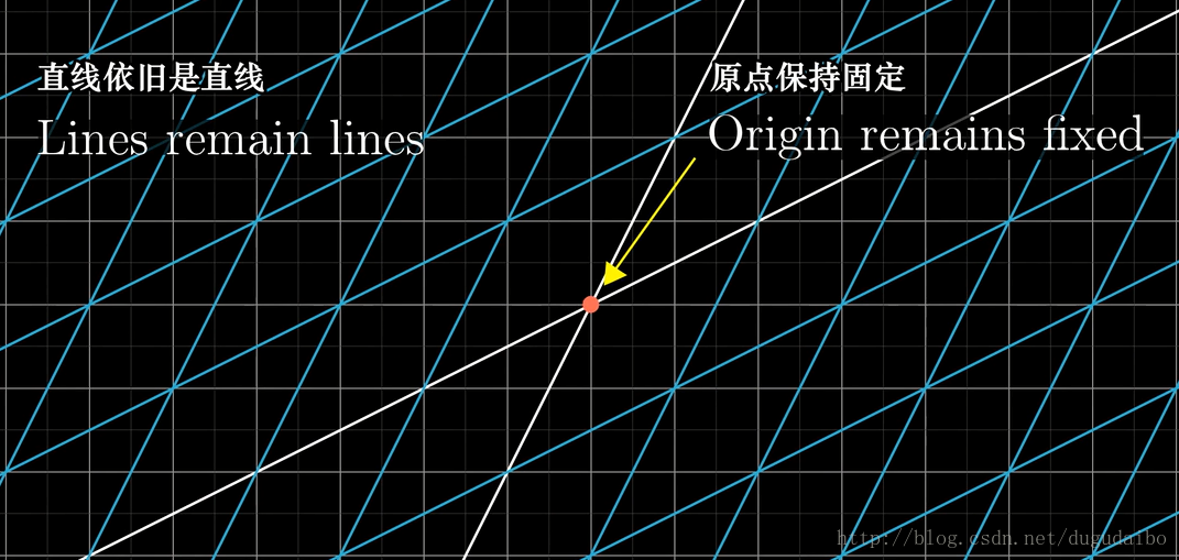 从几何的角度考虑,线性变换必须满足两点要求,首先变换前后直线依旧是直线,其次原点保持不变。值得注意的是不仅仅要考虑水平与竖直的直线变换前后是否依旧是直线,还要考虑对角线的不是水平的线。如下图所示