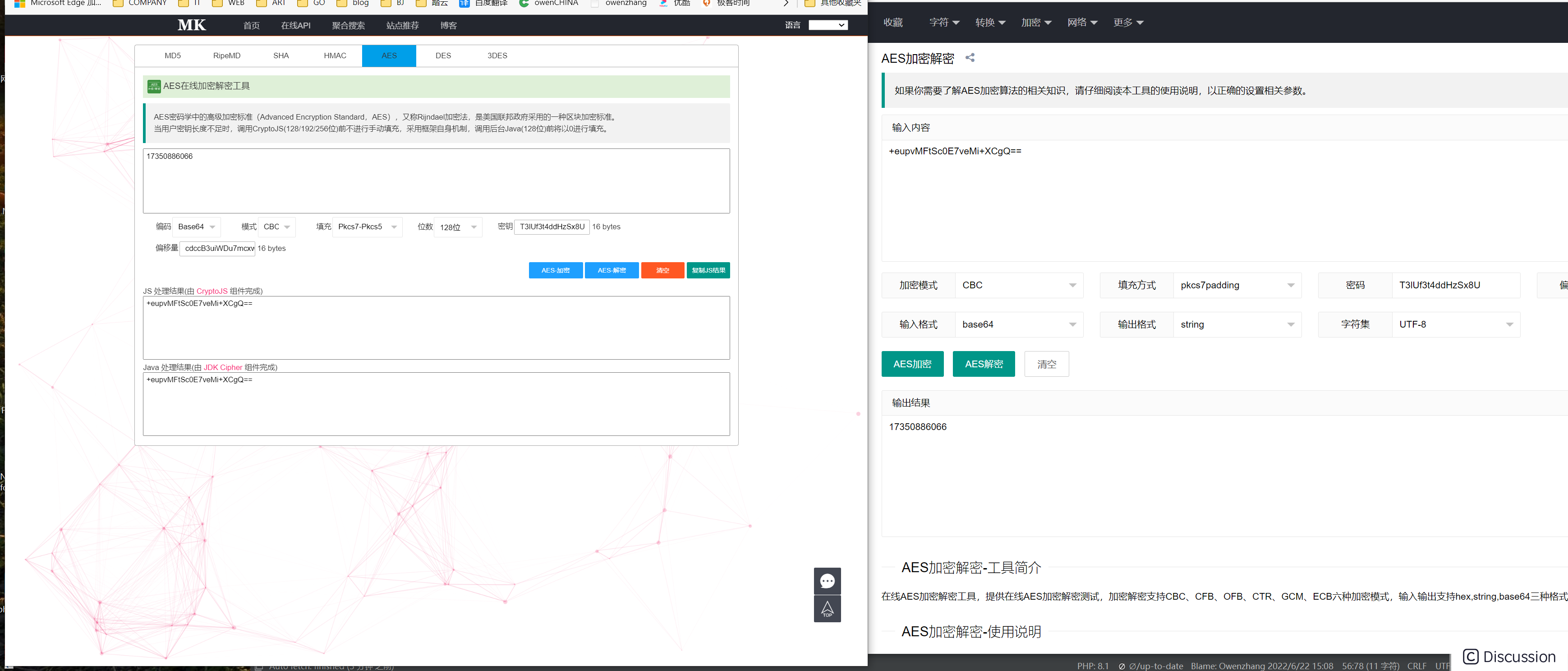 const APIAESKEY = 'T3lUf3t4ddHzSx8U'; $mobileAesEncrypt = AesService::instance()->setkey(APIAESKEY)->encrypt('17350886066');