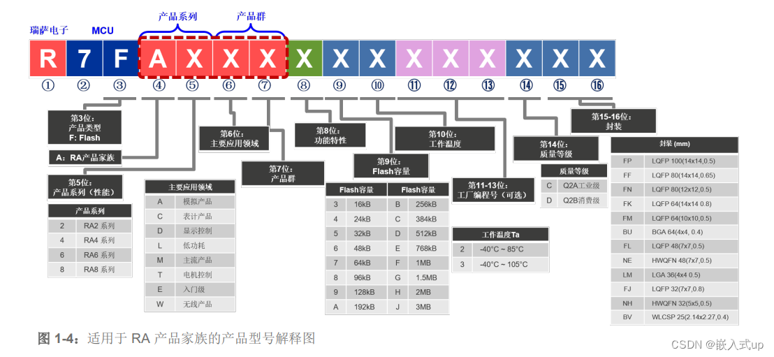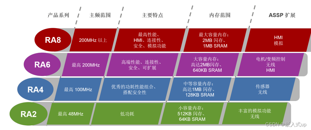 全新 RA 产品家族包括:RA2 系 列,适用于低功耗应用;RA4 系列,适用于需要低功耗、高性能和高安全性的设备;RA6 系列,具有卓越的连 接性能和安全性能;RA8 系列,可以为采用人机界面、连接、安全和模拟功能的应用提供出色性能。