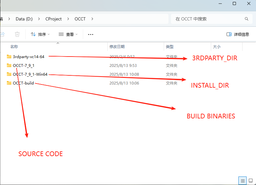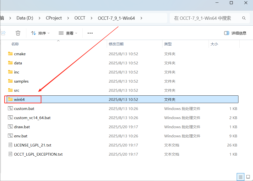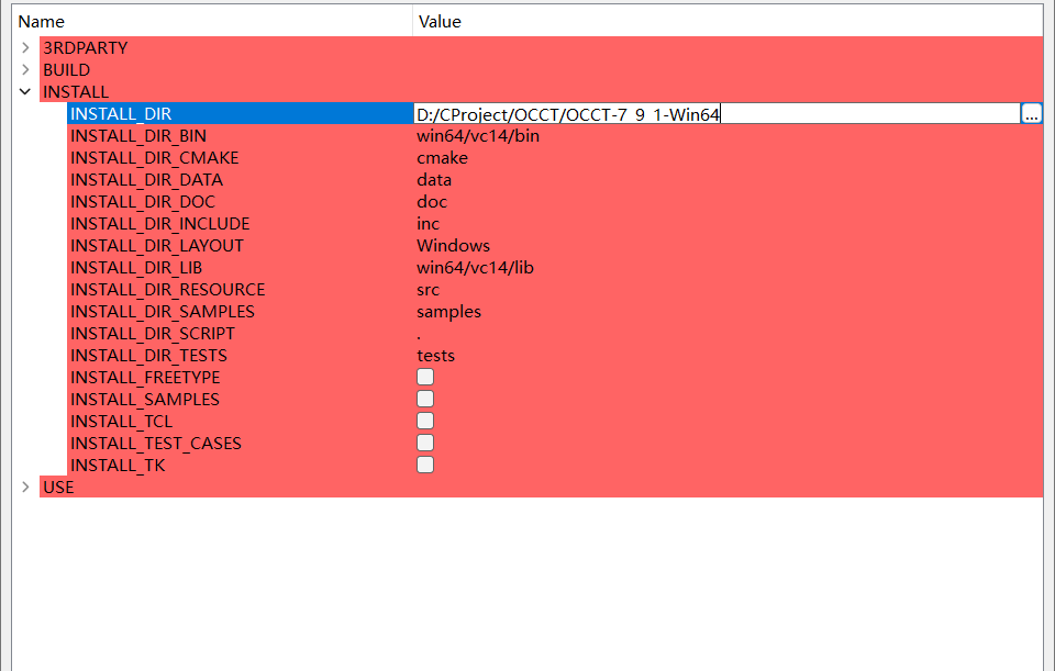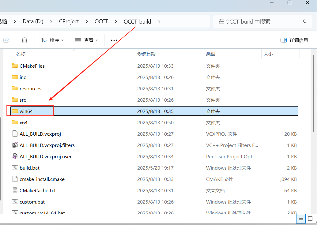 需要将OCCT-build目录下的win64复制到OCCT-7_9_1-Win64文件夹下,覆盖原来的win64文件夹,然后重新对INSTALL选择生成: