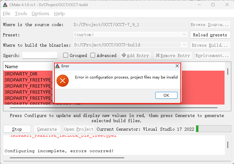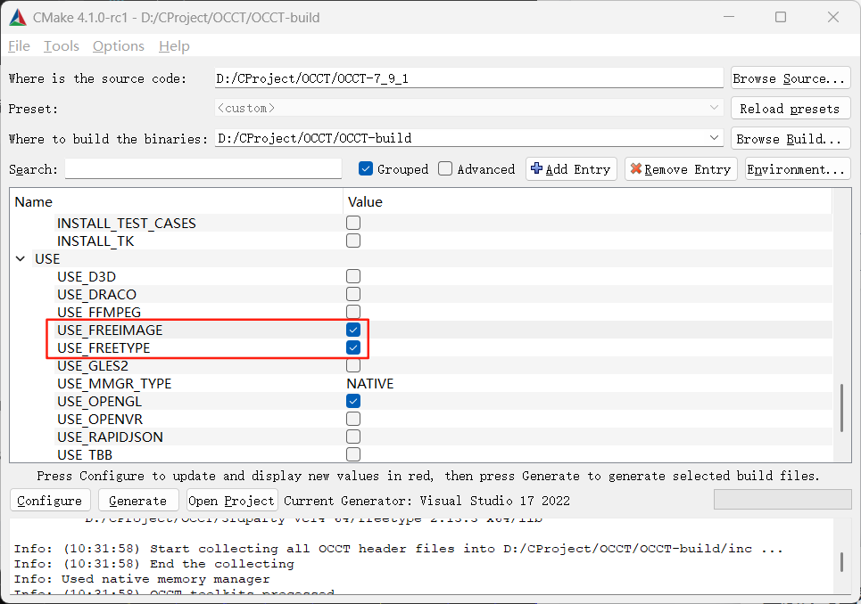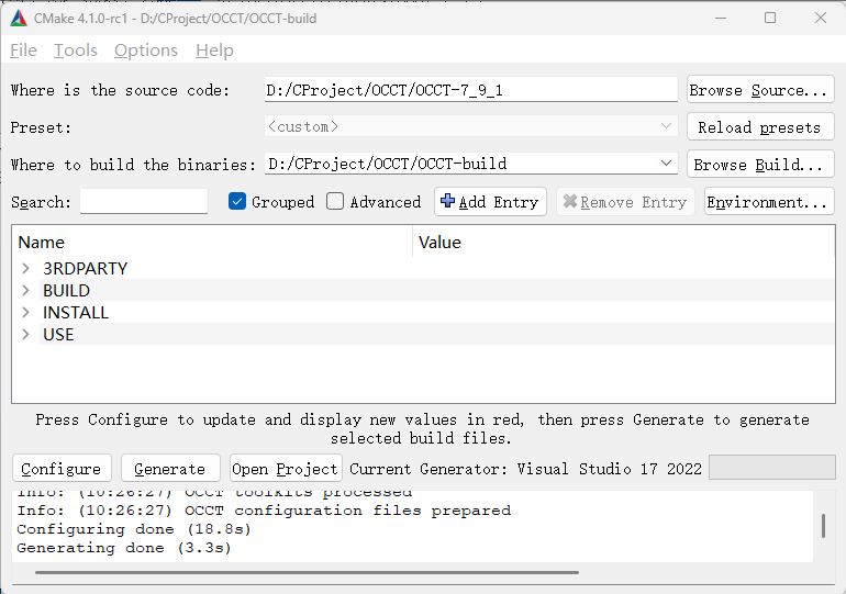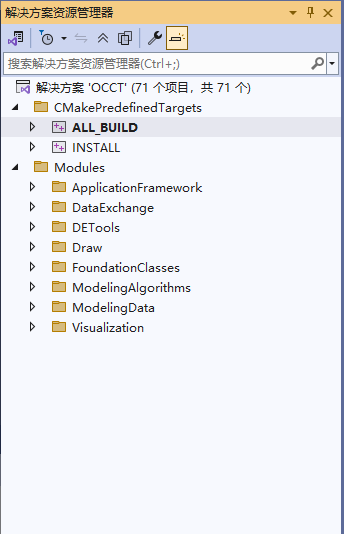点击Cmake下方的Open Project打开项目,或者在OCCT-build目录下,点击OCCT.sln打开项目