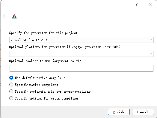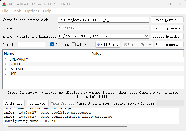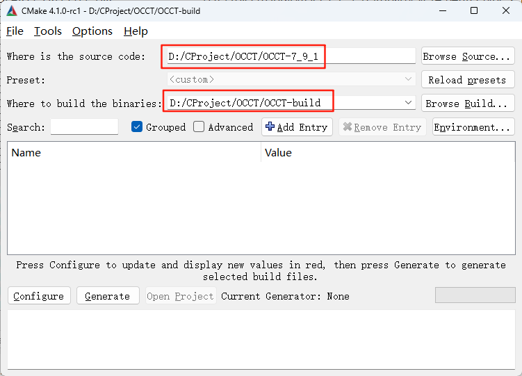 打开Cmake,并浏览至对应目录,点击Configure按钮: