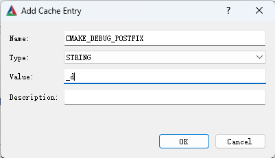 点击Add Entry按钮,添加新的项CMAKE_DEBUG_POSTFIX: