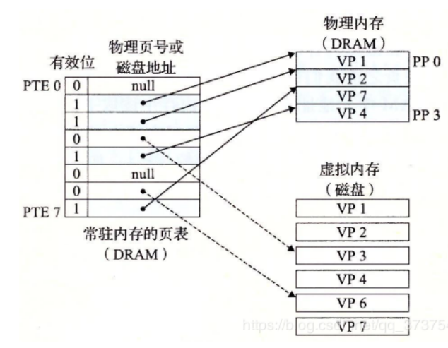 在。虚拟页1、4、 6被缓存在物理内存中。虚拟页2、 5、 7已经被分配,但是还没有缓存到物理内存中