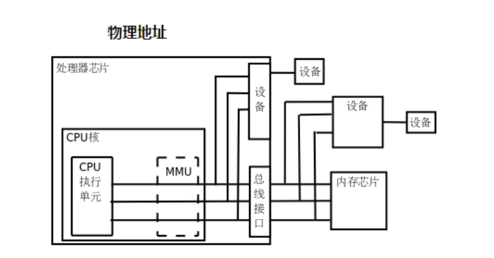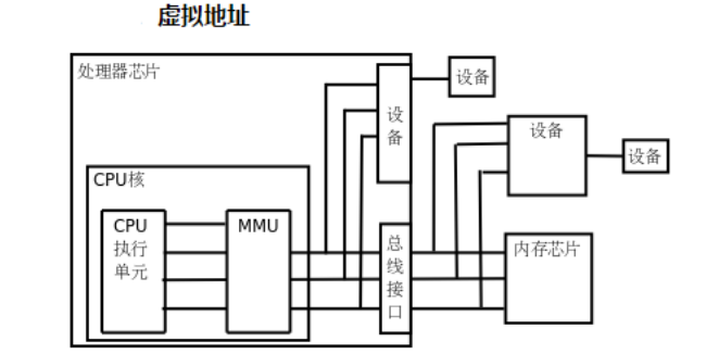 如果处理器启用了MMU,CPU执行单元发出的内存地址将被MMU截获,从CPU到MMU的地址称为虚拟,而MMU将这个地址翻译成另一个地址发到CPU芯片的外部地址引脚上,也就是将VA映射成PA,,如下图3-1-2。