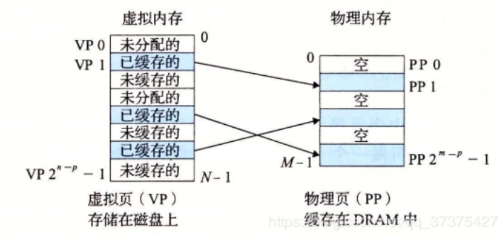假设页的大小为P。在虚拟内存中,叫做虚拟页(VP)。从虚拟内存拿了一个页的代码要放到物理内存,那么自然物理内存也得有一个刚好一般大小的页才能存放虚拟页的代码。物理内存中的页叫做物理页(PP)