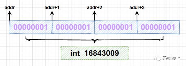 分析一下运行结果,首先使用allocateMemory方法申请4字节长度的内存空间,在循环中调用setMemory方法向每个字节写入内容为byte类型的1,当使用Unsafe调用getInt方法时,因为一个int型变量占4个字节,会一次性读取4个字节,组成一个int的值,对应的十进制结果为16843009,可以通过图示理解这个过程: