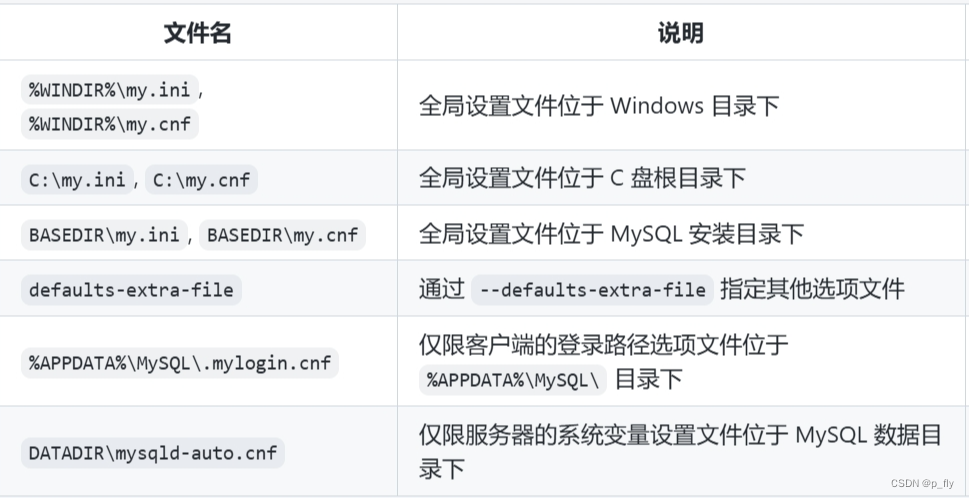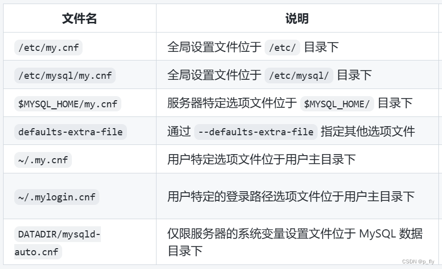 如果启动时没有指定配置文件,MySQL则是按照下面表格的顺序查找并读取文件。读取顺序从上到下,越下面的文件优先级越高。也就是下面的选项值会把上面的选项值覆盖(如果有冲突的话)。文件不存在则需要手动创建。