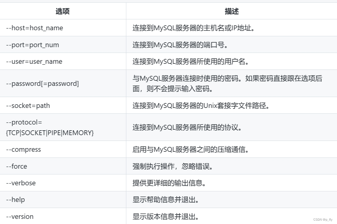 长格式:长格式选项通常以两个短横线(--)开头,后跟选项的完整名称。例如,--host、--user、--password 等。长格式选项更具可读性,但在键盘上输入时可能较为繁琐。