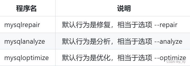 | mysqlcheck | 检查、修复、分析和优化表。 |