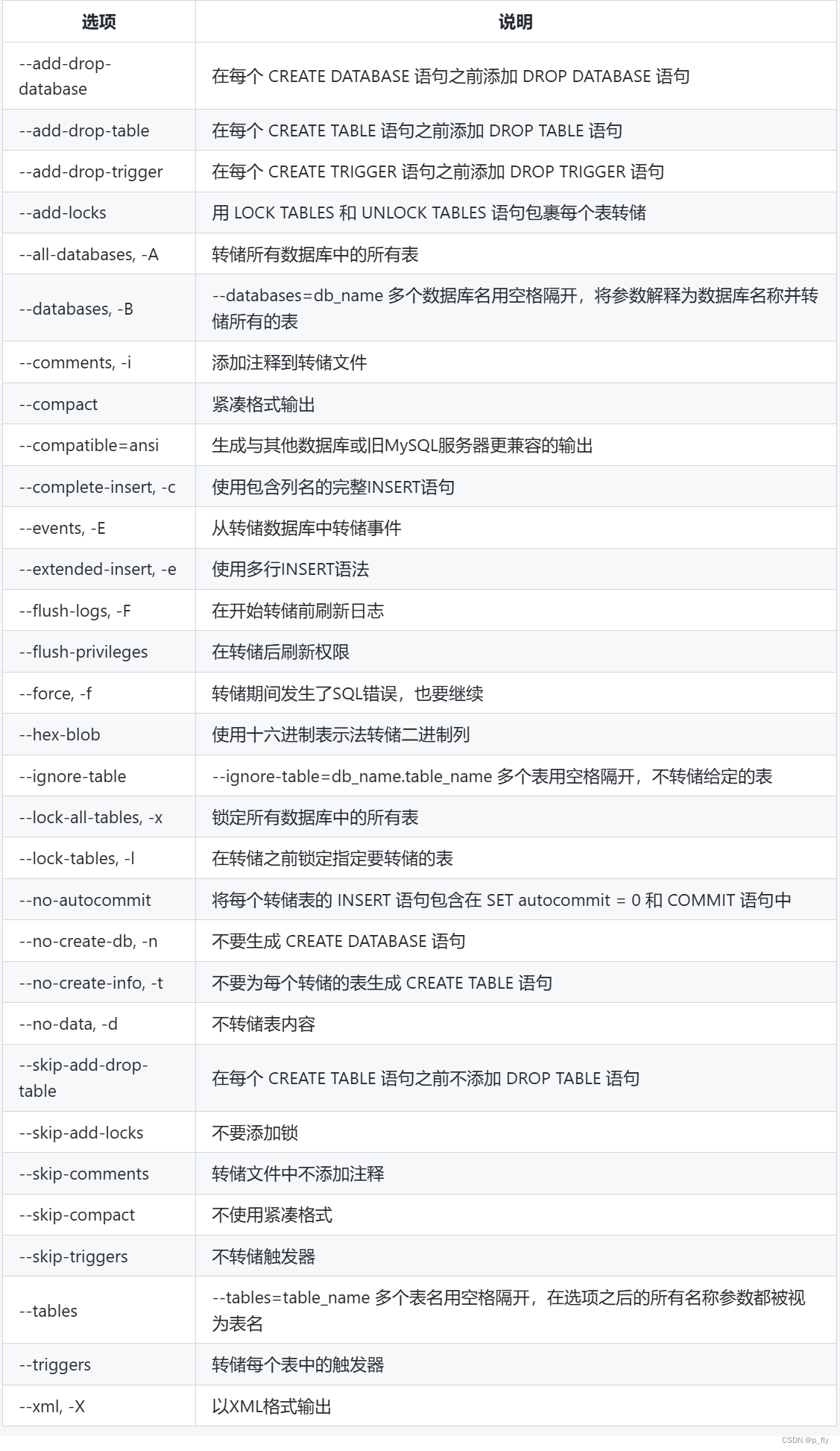 如果在 db_name 后没有指定任何表名,或者使⽤ --databases 或 --all-databases 选项,那么整个数据库都会被转储