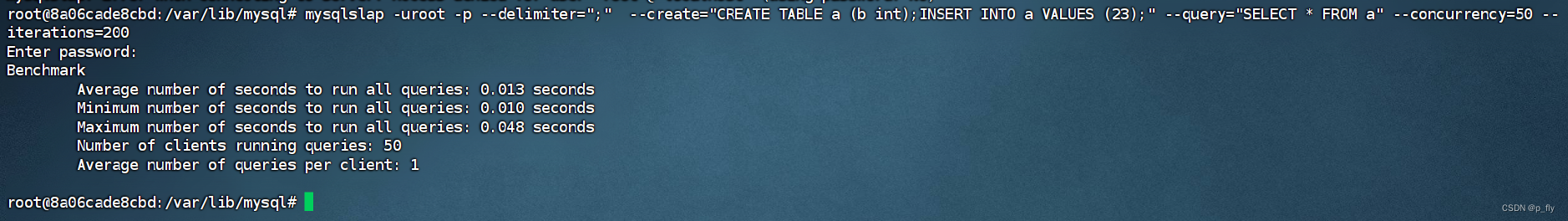 mysqlslap -uroot -p --delimiter=";" --create="CREATE TABLE a (b int);INSERT INTO a VALUES (23);" --query="SELECT * FROM a" --concurrency=50 --iterations=200