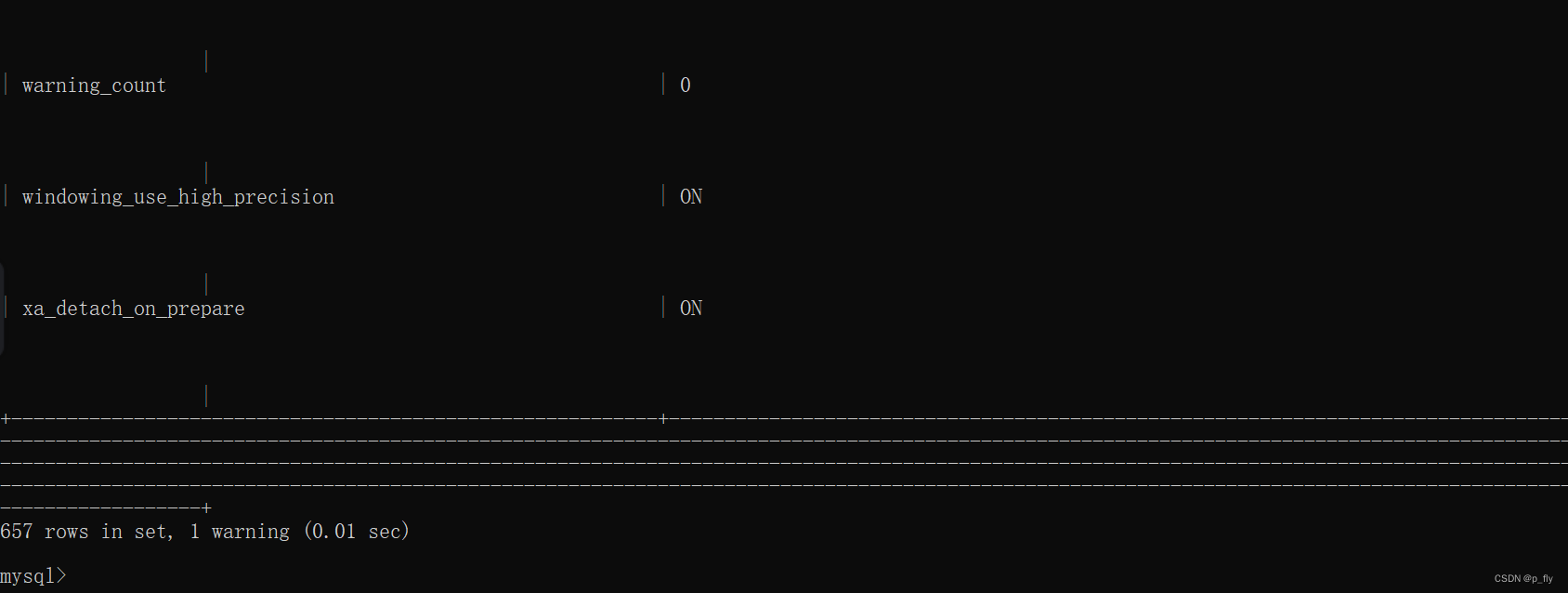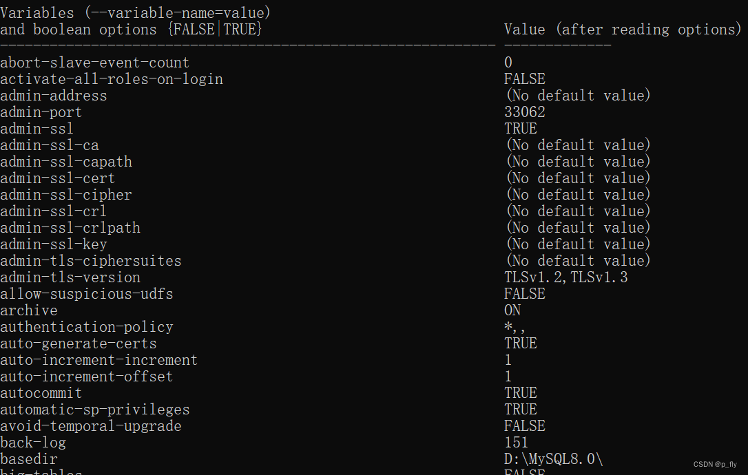 使用该命令,会把mysqld的选项和系统变量列出来。一般不使用这个命令,因为它把选项和系统变量都输出了,我们可以在官网查看这些选项。
