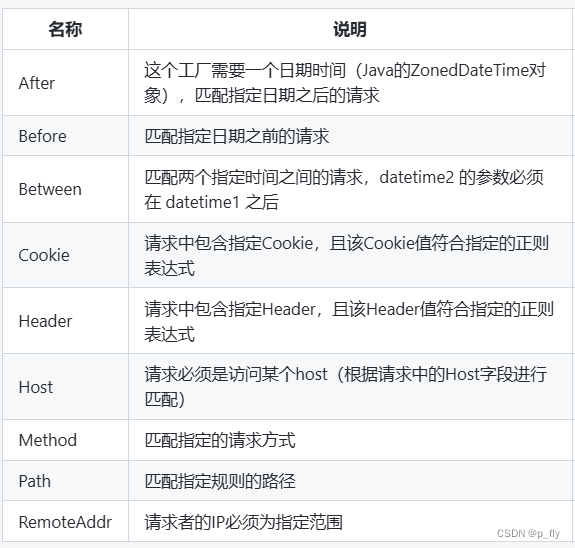 Spring Cloud Gateway默认提供了很多Route Predicate Factory,这些Predicate会分别匹配HTTP请求的不同属性,并且多个Predicate可以通过 与 逻辑进行组合。