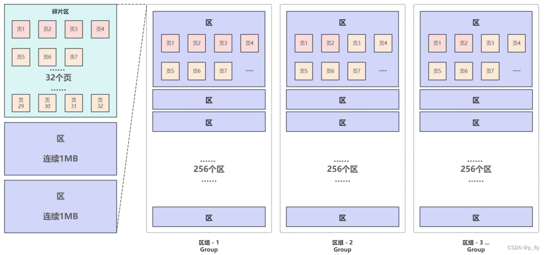 这些零散的页会放在表空间中的碎片区,当碎片区达到32个页之后,后续如果还要申请空间,就会申请32个页,这32个页就是区,用来管理页的数据结构。