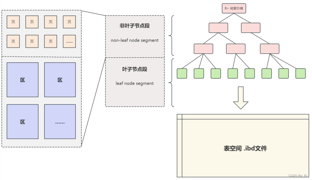 上面的 行、页、区和区组都是物理结构来存储数据的,而段并非是物理结构的存储。段的主要作用是区分不同功能的区以及在碎片区中的页。主要分为两类:叶子节点段和非叶子节点段,这两个段对应于B+树索引结构中的叶子和非叶子节点。