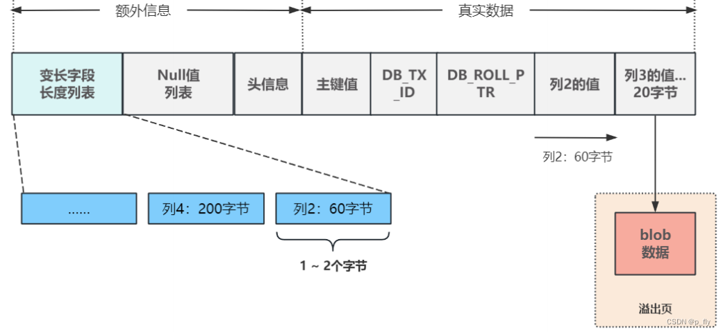 当可变类型是text、blob时,直接把这个列放入“溢出页”的独立表空间中,用20个字节来标记其位置。
