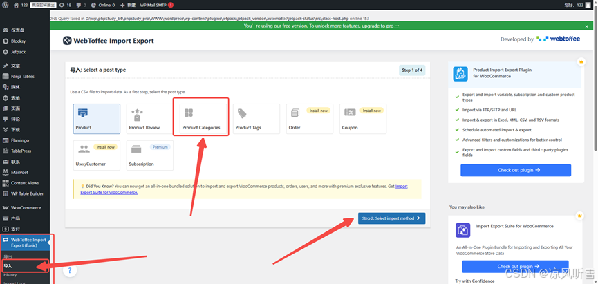 2、激活插件后,左侧点击插件下的导入,选择product categories,点击下一步