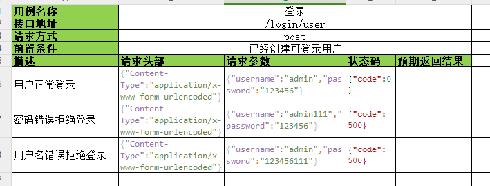 [{"caseNo": "01"},{"caseName": "正常登录"},{"reqParam": {"username":"admin","password":"123456"}}],
