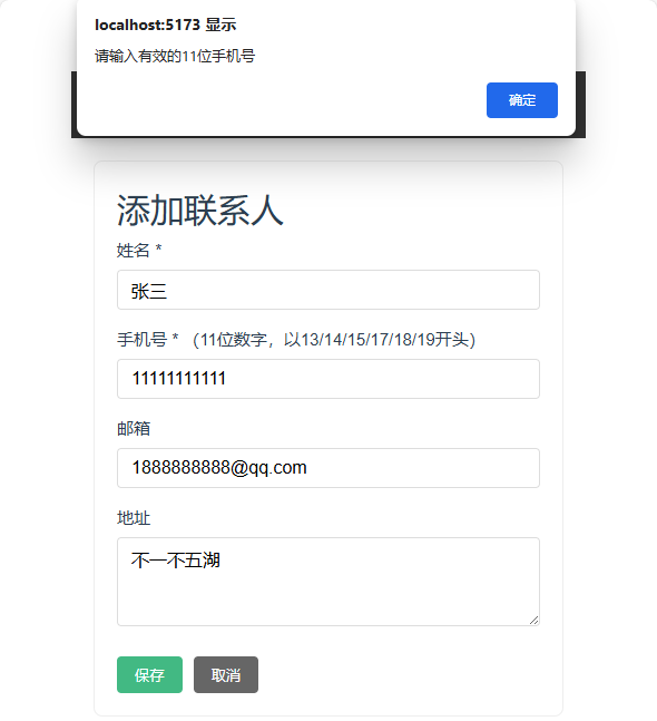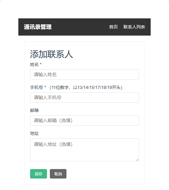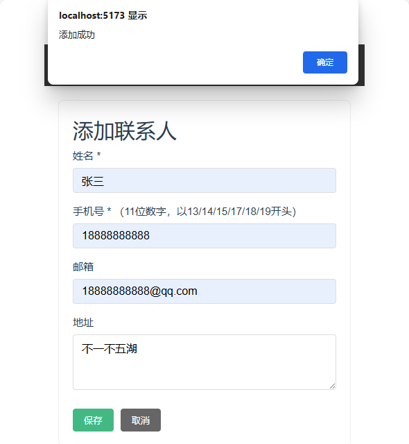 服务器框架:Spring Boot(基于 RESTful API 接口服务)数据访问:Spring Data JPA(简化数据库操作)数据库:MySQL(持久化存储联系人数据)跨域处理:@CrossOrigin 注解(允许前端 前端域名访问限制)数据校验:后端 请求参数合法性校验(确保姓名、手机号等字段符合规则)