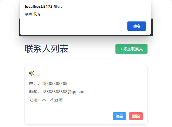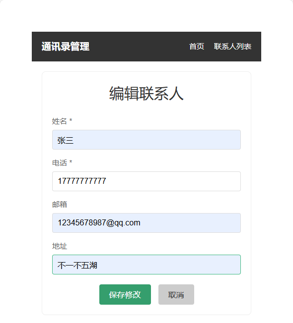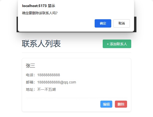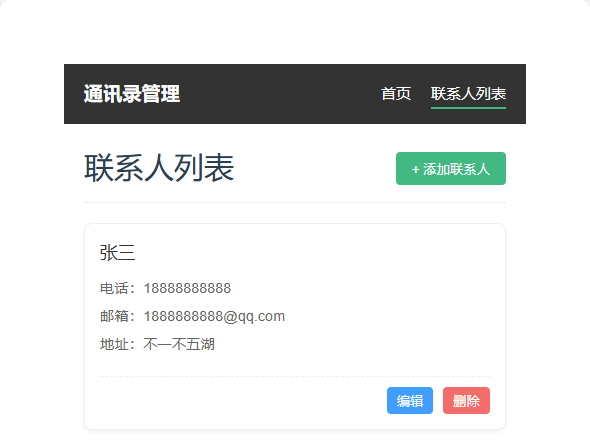 此次次作业旨在通过学习前后端代码并灵活运用,开发实现简易的通讯录系统,实现联系人的添加、删除与编辑等基础功能。作业采用前后端分离架构确保通信顺畅,前端基于Vue框架,通过HTML构建联系人信息的输入表单、列表展示及编辑删除界面;后端使用Spring Boot框架,整合Spring Data JPA与MySQL数据库存储数据,提供RESTful API接口并配置跨域支持,实现前后端的流畅交互。