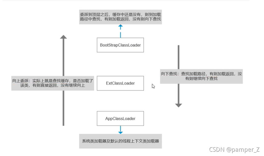 向上委派到顶层加载器为止,向下查找到发起加载的加载器为止