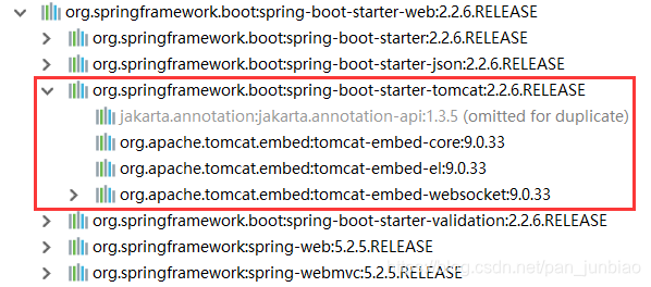 SpringBoot默认使用Tomcat作为内嵌式的Servlet容器,查看 spring-boot-starter-web 依赖如下: