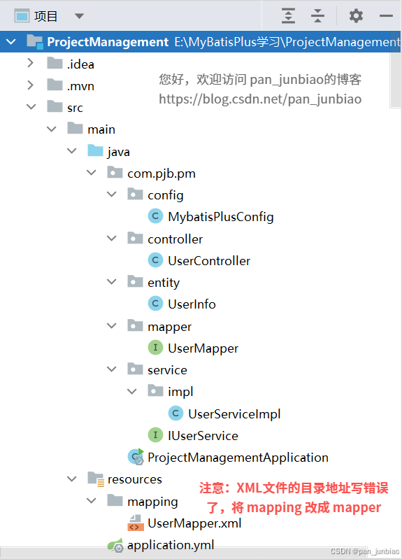 注意:上图中的存放 xxxMapper.xml 文件的路径写错误了,因为 MyBatis 框架中,默认的 XML 映射文件的目录地址是 resources/mapper 。