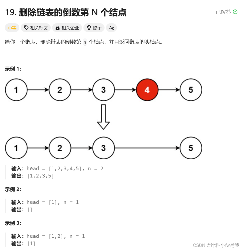 第一种做法就是遍历求出链表长度,这样我们就知道要删除的倒数第N个结点是正数的第几个了,我们再遍历到这个结点的上一个结点执行删除操作,同时因为n可能等于链表长度,所以我们需要建立虚拟头结点,这样就OK了。