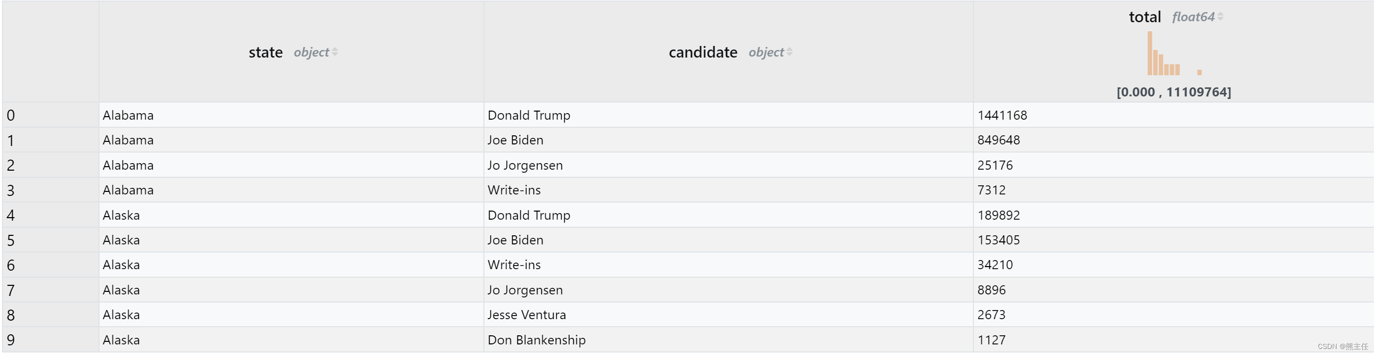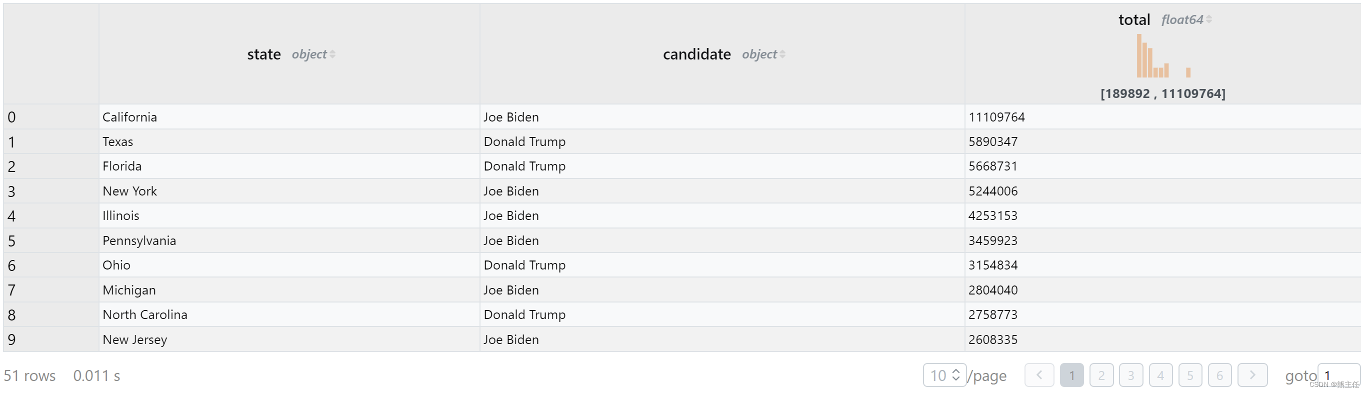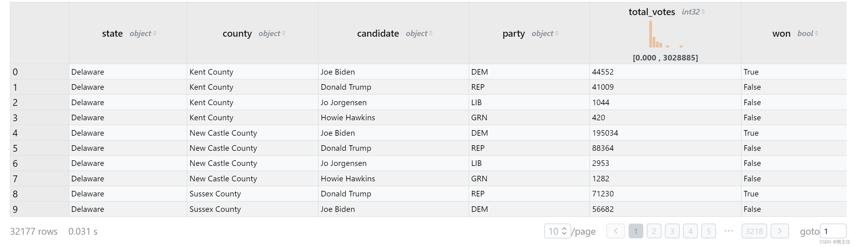 下面我们加载每个县的总统选取数据到数据集president_county_candidates,这个数据集是pandas的dataframe类型,并且可用于其它sql的输入源。