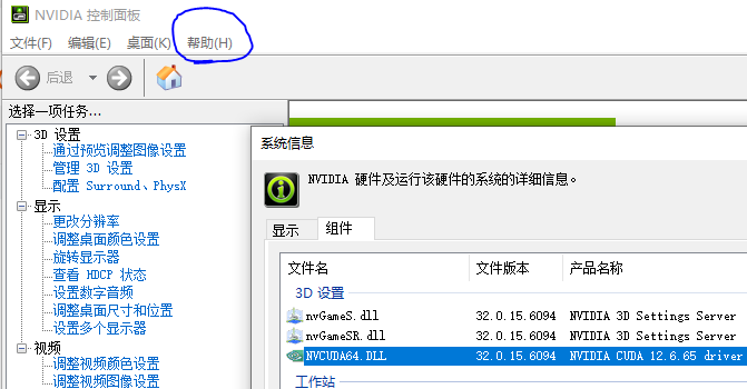 如何查看cuda版本,打开NVIDIA面板,点击‘帮助’→‘系统信息’,即可找到
