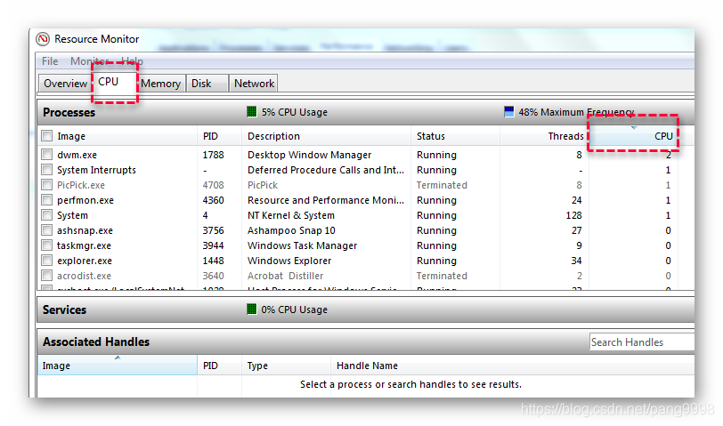 然后切换到cpu选项卡,将进程选择按照cpu占用率从高到低排序