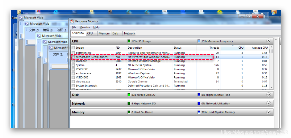 然后开始复现问题,到安装目录,双击VISIO.exe,在无限弹窗的时候果然发现了一个可疑进程:svchost.exe(DcomLaunch)