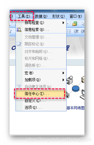 突然想到可能跟COM组件有关系!难道是VISIO启动的时候加载了有问题的COM组件导致无限重启的怪现象?非常有可能!印象中有时候word加载某些错误的组件之后也会出现各种问题。于是挂起DcomLaunch,打开visio.exe,找到“工具”-“信任中心”