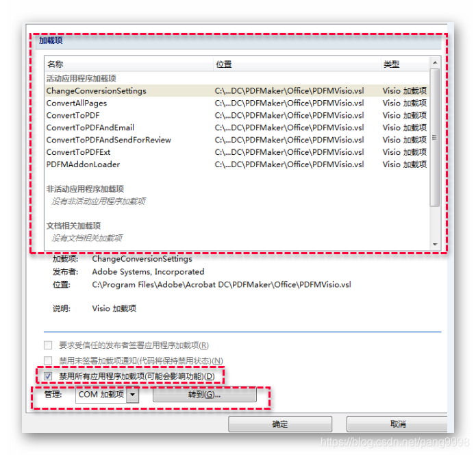 发现了一堆加载项,干脆全部禁用得了!于是勾选“禁用所有加载项”,确定。然后Rsume(使能)DcomLaunch进程,发现还是有多个弹窗,最后干脆点击图中“管理”那个“转到”,将所有com加载项全部删了。重启电脑之后发现问题已经解决!终于可以愉快的使用VISIO来画图了!
