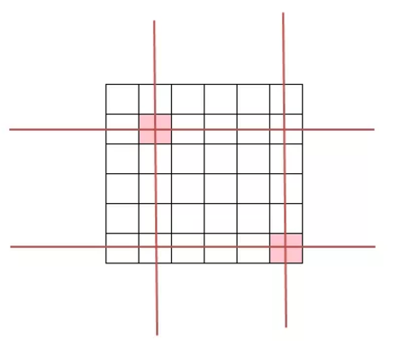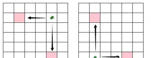 转折一次的算法也是比较明显的,像上图中的两种情况,找到绿色点的位置,如果这个点可以不转折连到两个红色的图片,那么这两个红色的图片就可以通过一次转折连接。