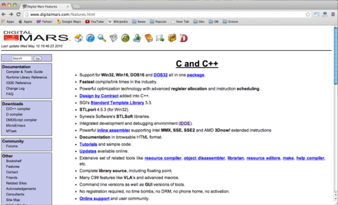 DigitalMars 是个高性能的 C 和 C++ 的编译器,包括许多很棒的特性,比如最快的编译/链接 时间,强大的优化技术,关联设计,完整的库资源,HTML 可读文档,反汇编程序,库管理,资源编译,make 等等。有命令行和 GUI 版本,教程,示例代码,在线更新,标准模版库和其他更多的功能。