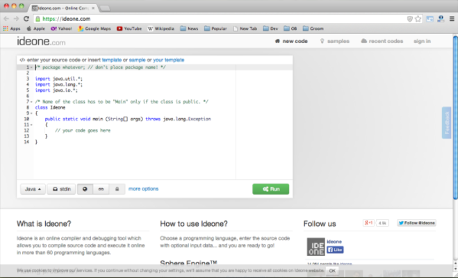 Ideone 是 C 和 C++ 的在线编译和调试工具,支持其他的 60 种语言。这个工具提供许多强大的功能,允许程序员快速高效的编译源代码。