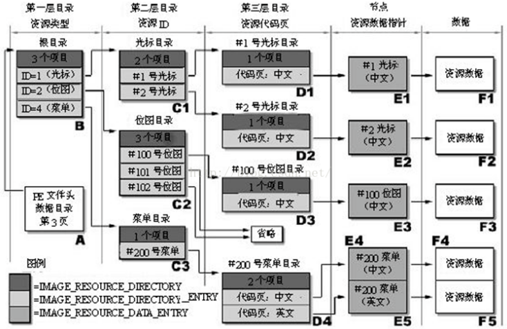 PE 文件中的资源是按照 :资源类型 -> 资源ID -> 资源代码页 的3层树型目录结构来组织资源的,通过层