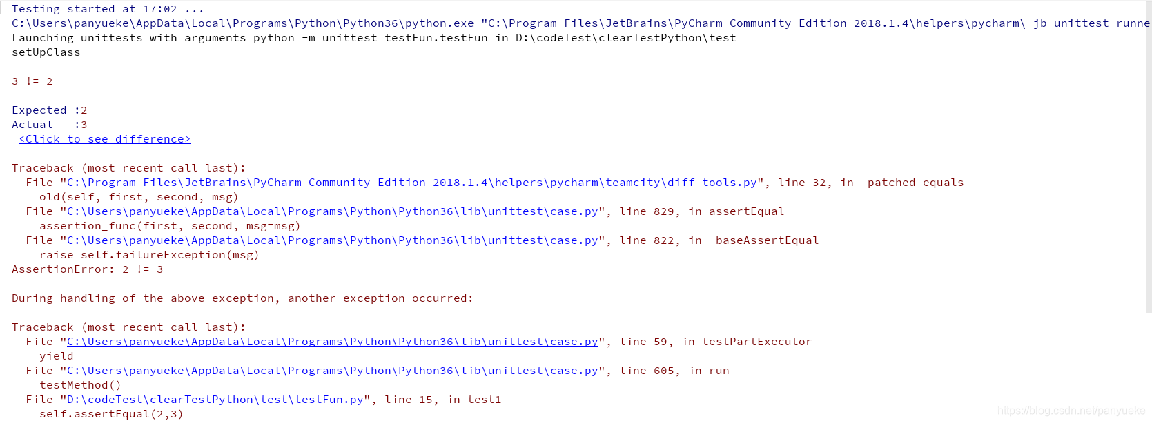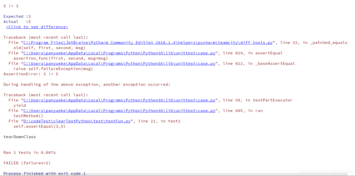 assertEqual(a,b) 如果a!=b,运行之后控制台会报错: