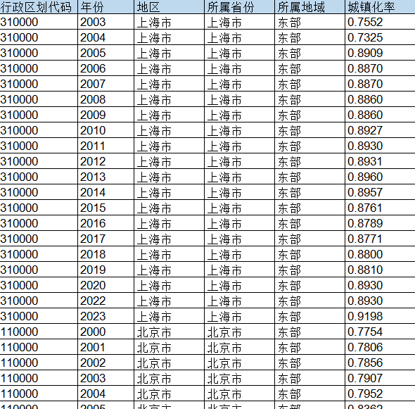 指标:行政区划代码、年份、地区、所属省份、所属地域、城镇化率。